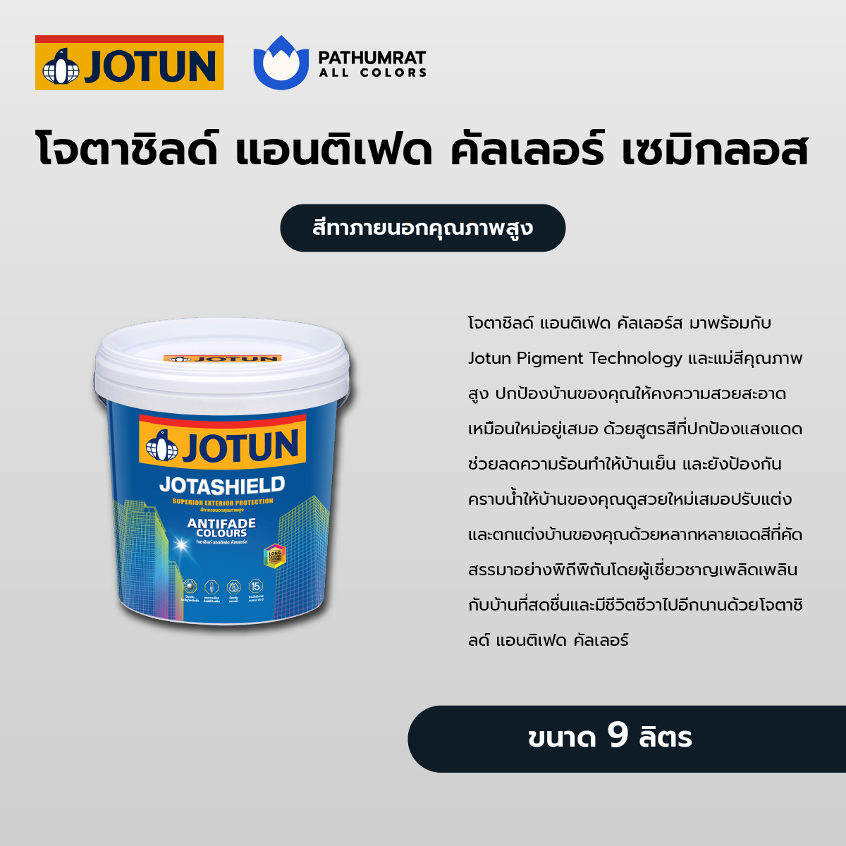 สีทาบ้าน คุณภาพสูงจากโจตัน สีน้ำทาอาคาร รุ่น โจตาชิลด์ แอนติเฟด กึ่งเงา เป็นสีคุณภาพ สีสดใส ทนทุกสภาวะ ทุกฤดูกาล อายุการใช้งานยีนยาว ปริมาณ 9 ลิตร