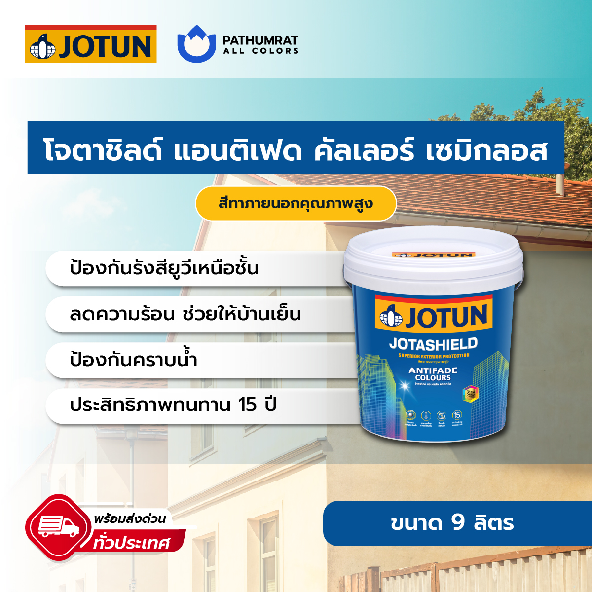 สีทาบ้าน คุณภาพสูงจากโจตัน สีน้ำทาอาคาร รุ่น โจตาชิลด์ แอนติเฟด กึ่งเงา เป็นสีคุณภาพ สีสดใส ทนทุกสภาวะ ทุกฤดูกาล อายุการใช้งานยีนยาว